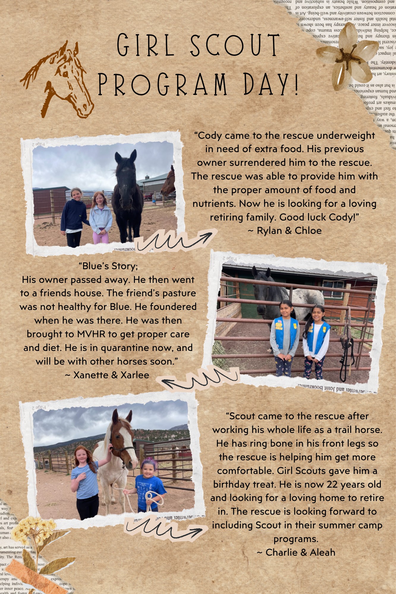 | Newsletter April 2026 As this newsletter goes out, the days at the ranch this week have been colder with some much needed rain and snow. A more regular weather pattern for Spring in the mountains. We are looking forward to the Help a Horse Day Spring Fling & Volunteer Appreciation on Saturday, April 26th. Learn more about this special day below and we hope to see you there! The horses are doing well, and 2026 is shaping up to be one of our most successful adoption years yet! So far 10 horses have found their new Journey this year, with another 7 leaving for their next adventure in the next few weeks. We welcomed 4 intakes to quarantine in April. All these intakes and adoptions leave 38 horses currently in MVHR care, all looking to graduate from their Journey of Hope. As always, our waitlist never seems to get shorter and it has been busier with intake requests due to the drought and concerns about upcoming hay prices. Spring program season has been busy, with the horses getting visits and care from a Girl Scout Troop, Helping Hands Workshop participants and of course our Mini Horse Heroes. Read about the Girl Scout visit last week below as they earned a badge for their service! In the next two weeks, we'll welcome over 100 school students for field trips and service days. If you are still looking for a fun and educational summer for your horse crazy kids, there are still camp spots available both with transportation from Eagle and Yampa! Scroll down for the registration button! Continue reading for more details and updates from MVHR! |