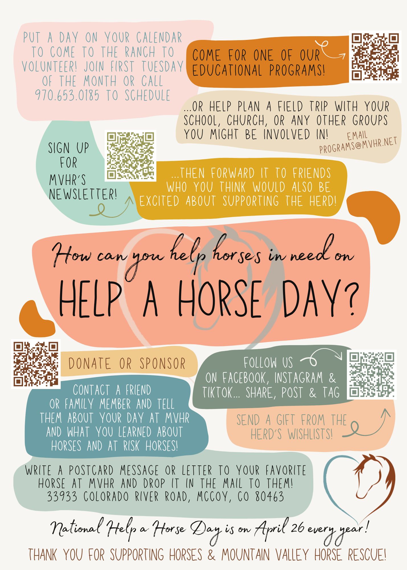 | Next Week: April 25! Spring Fling, Help a Horse Day. Join us on Saturday, April 25th for a special Community Volunteer Spring Fling & Open House! Come help the horses with a variety of chores and projects around the ranch from 10am till 2pm. Come early for a pancake breakfast at 9:30am, followed by an assignment of a task that fits your abilities! Bring the whole family, and pack a lunch if you'd like to stay all day. We will celebrate the day & all our volunteers at 1:30pm with cake! The Afternoon will include Educational Horse Stations & Activities. This is our big Spring Fling to get ready for Summer! We hope to see you all there! National Help a Horse Day on April 26th each year encourages horse lovers and advocates to join forces and protect abused and neglected horses. National Help a Horse Day is celebrated annually on April 26. The day was created by the American Society for the Prevention of Cruelty to Animals (ASPCA) to raise awareness of the need to protect horses from abuse and neglect. The date was chosen because it's significant to the ASPCA's history of horse protection. In 1866, ASPCA founder Henry Bergh stopped a cart driver from beating his horse on April 26, resulting in the first successful arrest for horse mistreatment. Volunteer Trainings! We have Volunteer Training available on the first Tuesday of each month, the next one coming up on May 5th. If this does not work for your schedule, you can also schedule a training by appointment. For more info click here! Complete a volunteer application to ensure that you receive a volunteer opportunity email each month. Thank you to ALL Volunteers, MVHR could not help as many horses without you! |