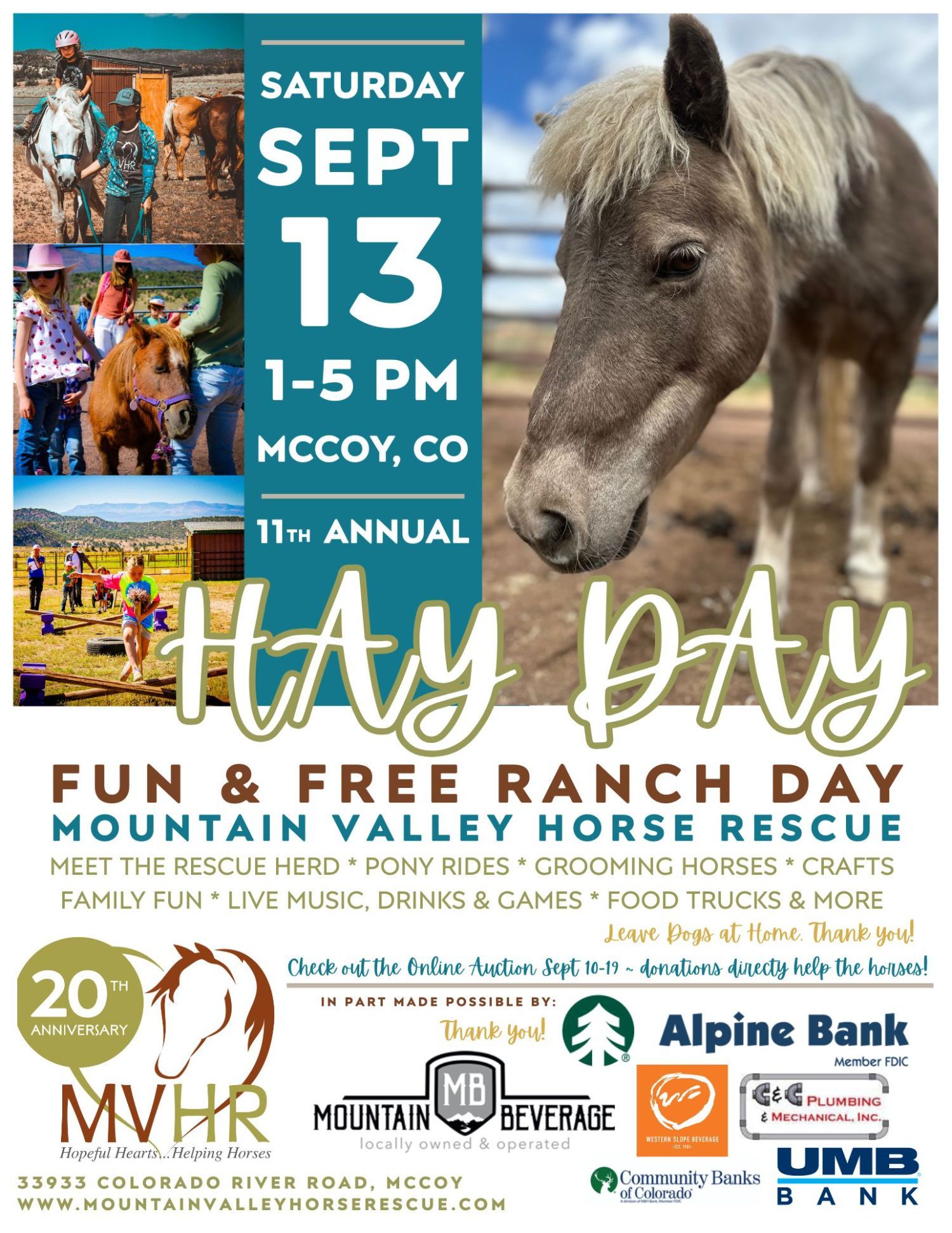| | And just like that... ...we are well into August when the evenings are starting to be cooler and these sunsets are so beautiful at the ranch. Another huge thank you to everyone who came to the Brunch for Horses, donated and supported the Feed the Horses Hay Campaign! We raised just over $70K to Feed the Herd for the next year! We could not be more grateful for your generosity, whether you attended the event or supported the campaign online! We just wrapped up Summer Day Camps last week. Over 400 program participants visited the ranch since the beginning of Summer, and there is more scheduled for August. Staff is busy scheduling Fall programs, and more importantly planning Hay Day 2025, MVHR's Ranch Open House on September 13! and the Online Hay Day Auction! A new event benefitting MVHR and other local Nonprofits just got scheduled on October 1: The SteamMasters Charitable Golf Outing at Sonnenalp in Edwards! Are you a golfer, check out below how you can register your team! As we have shared last month, the rescue has been bursting at the seams, so we are excited to share that several adoptions have finalized. With nearby wild fires in Routt County and possible evacuation intakes we are helping with, new rescue intakes are postponed to later this month. There are however several horses in dire need, with just this past week MVHR receiving 6 new requests, each for multiple horses. We have a whole herd of wonderful horses that are ready for their next adventure, from trail horses to project horses, lovely companions and easy going horses, if you are looking, the herd is ready to meet you! Also, we have added a Tuesday volunteer training in August, September and October. And MVHR is hiring! Scroll down to find out more. Continue reading for more details and updates from MVHR! | | MVHR Horse Updates! August is off to a wonderful start with adoptions finalizing for Clementine, Padme, Molly, Ginger, Daisy and Dolores! Yes, you read that right, Dolores who came to us just 4 weeks ago left for her new home already! We knew this sweet and cute Mule wouldn't be with us long, but this might be a record adoption at MVHR! Another recent intake, Hanson, started his adoption trial with a great partner he will continue to learn with, and left for the Aspen area earlier this week. Recent intakes Pinto Bean, Blue and Juniper have settled in to the herd with others. Darcy, who was in a foster home for the past year, has returned to the ranch. This OTTB is goofy, energetic and would make a best friend for life, but can no longer be ridden so is looking for someone who enjoys groundwork and round pen play. Interested in your next horse, or know someone who is? Amazing horses are waiting for their next adventures! Come meet Lucy, Cremello, Daci, Zephyr, Dancer, Cricket, Lucky, Darcy, Ernie, Gem, Dolly, Babe, Latigo, Huckleberry, Hammer, Rebel, Boomer, Big, Freddie, & Belle! Adoptions make it possible for us to help more horses with next chapters of their own, and for you to have an amazing horse in your life! A full list of the Current Herd can be found by clicking below! | | | | | | | | MVHR Community, Events & Programs | | | | Hay Day - September 13! MVHR's 11th Annual Hay Day Open House will be on Saturday, September 13th! This Fun & Free Day at the ranch includes games, pony rides, ranch hand relays, stick horse races, pony petting & grooming fun and of course meeting the rescue herd. We wrap up our 20th Anniversary Celebration year with Live Music, Drinks and food trucks on site! Hay Day 2025 is made possible by Alpine Bank, Mountain Beverage, C&C Plumbing, Western Slope Beverage, UMB Bank & Community Banks of Colorado. Thank you Sponsors! We are looking for volunteers for Hay Day! Read below if you are able to help on Sept 13! Can't make it? The Hay Day Online Auction will be back this year Sept 10 - 19, so keep an eye on that to support the horses, even from afar! | | | | | | Steammaster's 18th Annual Charity Golf Outing The 18th Annual SteamMaster Golf Tournament returns on Wednesday, October 1st at 10am for a Scramble Tee Off at Sonnenalp Golf Club in Edwards! We are humbled MVHR has been chosen as a beneficiary this year! This event will benefit the Vail Valley Charitable Fund, Mountain Valley Horse Rescue, and Eagle County Emergency Responders Fund. To register a team, donate a silent auction item, or sponsor the event, please contact Raj Manickam at 970-904-2409 or raj@steammaster.com. | | | | | | | | | | | | Volunteer Opportunities! Calling ALL Volunteers! We need your help on Hay Day, Sept. 13th to make this event successful to share our mission with the Community! Whether you are seasoned, or new to MVHR, no training required to help out on this day! Interested? Sign up by emailing nancy@mvhr.net! Save the Date, these are the upcoming Community Volunteer Days & Orientations! - Saturday, August 16 - 9:30am-12:30pm